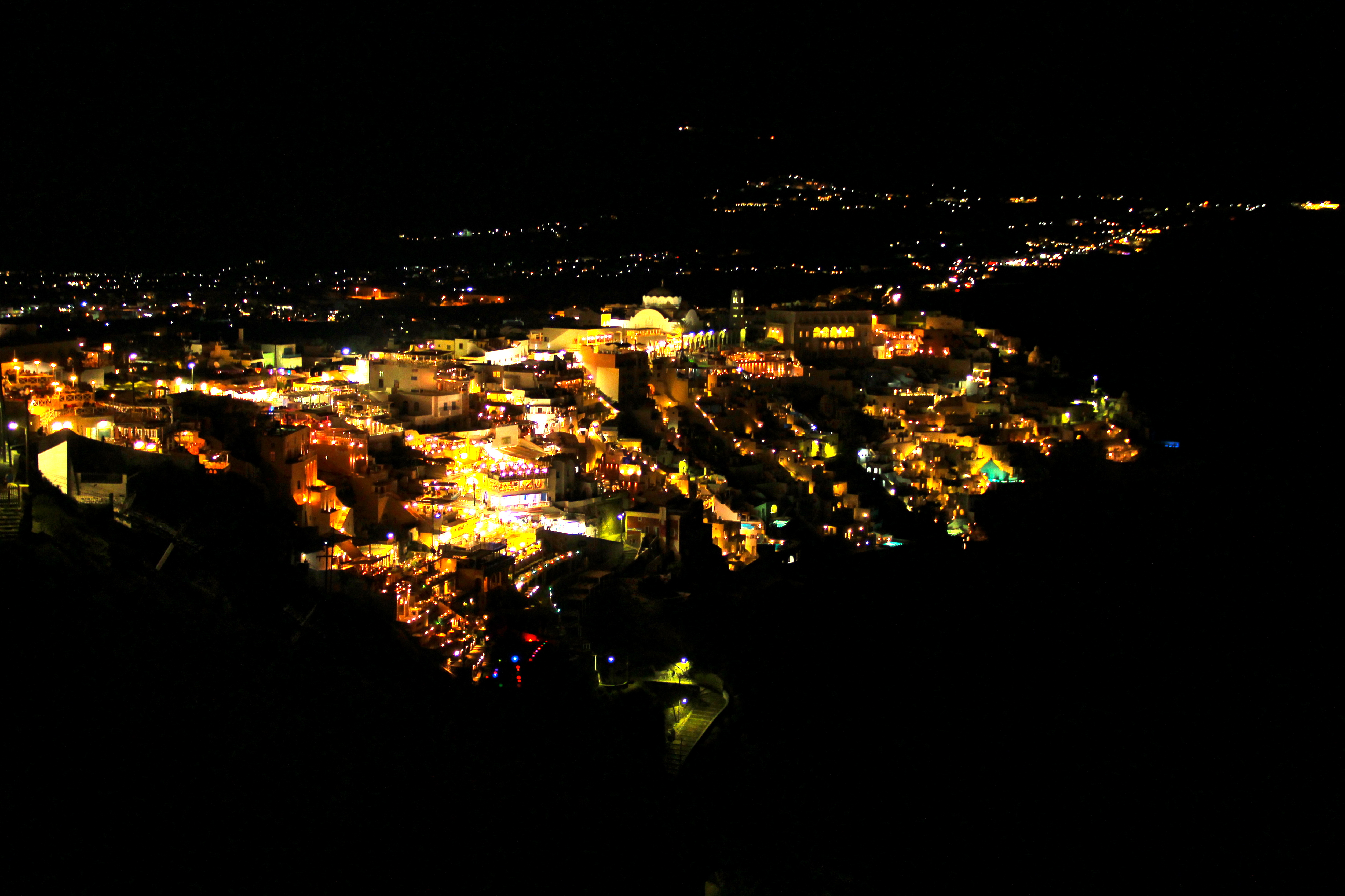 So with our tummies full and our cheeks glowing from the day’s sun (and maybe a little to do with the wine we’d sunk) we wandered along the path that runs across the cliff from Firostefani to Fira town (managing not to fall down). As we turned the corner where Firostefani village becomes Fira town, we noticed how pretty Fira looked all lit up at night… a vantage point we had not seen before. Of course… I couldn’t resist the urge to have a play with my camera & the shutter speeds – I am totally spoilt with opportunities to experiment and learn here!